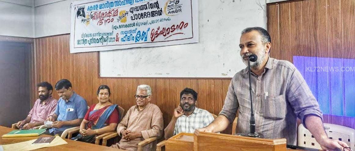 കൽപറ്റ : കേരള ശാസ്ത്ര സാഹിത്യ പരിഷത്ത് വയനാട് ജില്ലാ കമ്മിറ്റിയുടെ നേതൃത്വത്തിൽ ഹിരോഷിമ ദിനാചരണത്തിൻ്റെ ഭാഗമായി യുദ്ധവിരുദ്ധ പരിപാടി സംഘടിപ്പിച്ചു. ശാസ്ത്ര സാഹിത്യ പരിഷത്ത് ജില്ലാ പ്രസിഡൻ്റ് പി. അനിൽകുമാർ അധ്യക്ഷത വഹിച്ചു. പുരോഗമന കലാ സാഹിത്യ സംഘം ജില്ലാ സെക്രട്ടറി എം. ദേവകുമാർ ‘യുദ്ധത്തിൻ്റെ പാഠഭേദങ്ങൾ’ എന്ന വിഷയത്തിൽ അവതരണം നടത്തി. മാത്യൂസ് വൈത്തിരി യുദ്ധവിരുദ്ധ ഗാനമാലപിച്ചു. പരിഷത്ത് ജില്ലാ സെക്രട്ടറി കെ. പി. സുനിൽകുമാർ, ജില്ലാ ട്രഷറർ ടി. പി. സന്തോഷ്, വൈസ് പ്രസിഡൻ്റ് ഇ. ജി. ചന്ദ്രലേഖ, ജോ. സെക്രട്ടറിമാരായ കെ. ആർ. ചിത്രാവതി, എ. ജനാർദ്ദനൻ, കേന്ദ്ര നിർവാഹക സമിതിയംഗം കെ. എ. അഭിജിത്ത് തുടങ്ങിവർ സംസാരിച്ചു. യുദ്ധവിരുദ്ധ ഹ്രസ്വചിത്രം പ്രദർശിപ്പിച്ചു.