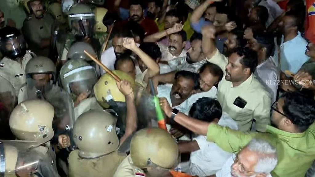 അഴീക്കോടന് സ്മാരകമായ ജില്ലാ സിപിഎം ഓഫീസിനു മുന്നില് പൊലീസ് തടഞ്ഞതിനെ തുടര്ന്ന് പ്രവര്ത്തകരും പൊലീസും ഉന്തുംതള്ളുമുണ്ടായി. പിന്നീട് കല്ലേറിലേക്കും ലാത്തിച്ചാര്ജിലേക്കും പ്രതിഷേധം വഴിവെച്ചു. കല്ലേറില് രണ്ട് ബിജെപി പ്രവര്ത്തകര്ക്ക് പരിക്കേല്ക്കുകയും ഇവരെ ആശുപത്രിയില് പ്രവേശിപ്പിക്കുകയും ചെയ്തു.