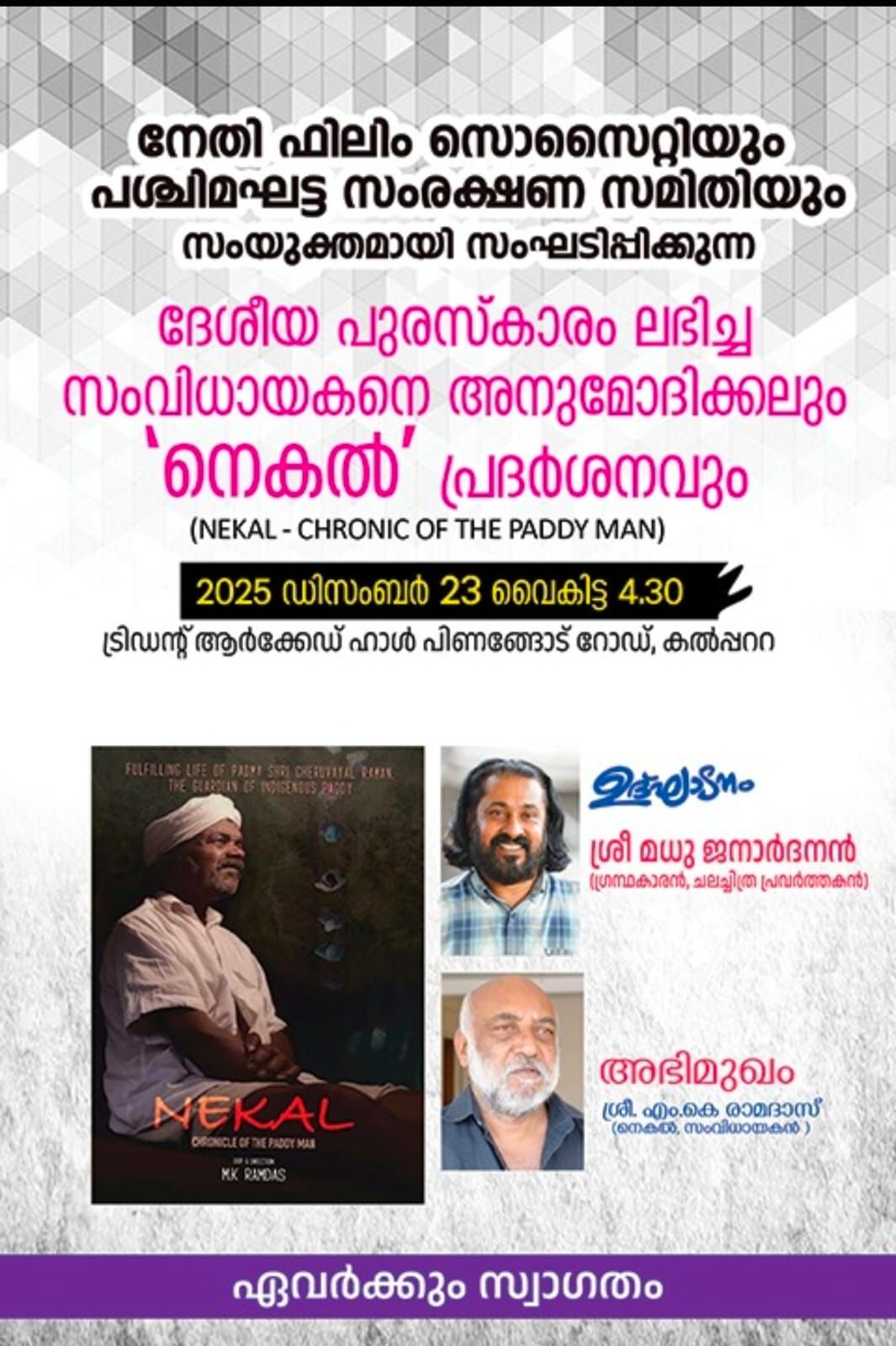 നേതി ഫിലിം സൊസൈറ്റിയും പശ്ചിമഘട്ട സംരക്ഷണ സമിതിയും ചേർന്ന് സംഘടിപ്പിക്കുന്ന പരിപാടിയിൽ നെകൽ സിനിമയിലൂടെ ദേശീയ അംഗീകാരം നേടിയ സംവിധായകൻ എം കെ രാമദാസുമായുള്ള അഭി മുഖവും നടക്കും. ചടങ്ങിൽ എം കെ രാമദാസിനെ ആദരിക്കും.