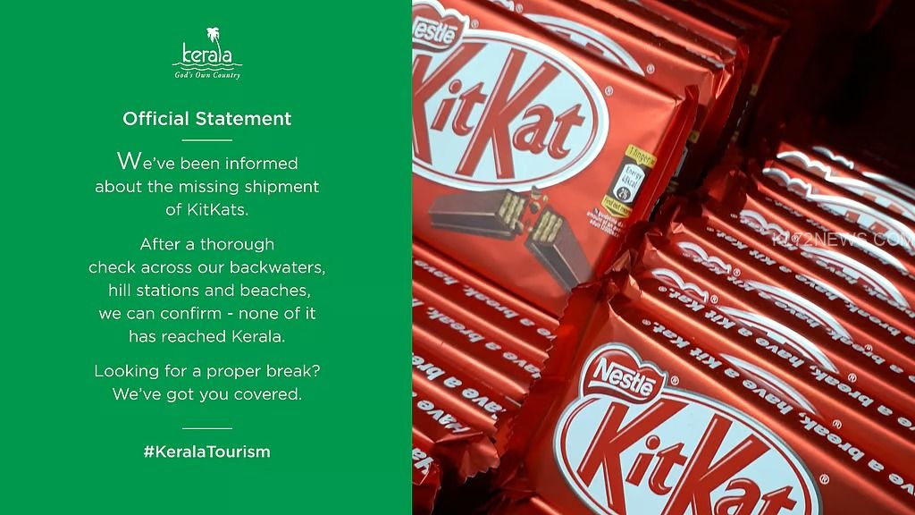 ‘കാണാതായ കിറ്റ്കാറ്റ് ഷിപ്പിങ്ങിനെക്കുറിച്ച് ഞങ്ങൾക്കും വിവരം ലഭിച്ചിട്ടുണ്ട്. ഞങ്ങളുടെ കായലുകളിലും മലയോരത്തും കടൽതീരങ്ങളിലും വിശദമായ പരിശോധന നടത്തി. അവയൊന്നും കേരളത്തിൽ എത്തിയിട്ടില്ലെന്ന് സ്ഥിരീകരിച്ചിട്ടുണ്ട്. ശരിക്കുമൊരു ബ്രേക്ക് ആവശ്യമാണോ? എങ്കിൽ ഞങ്ങൾ നിങ്ങൾക്കൊപ്പമുണ്ട്’- എന്നാണ് കേരള ടൂറിസം സോഷ്യൽ മീഡിയാ പേജിൽ കുറിച്ചിരിക്കുന്നത്.