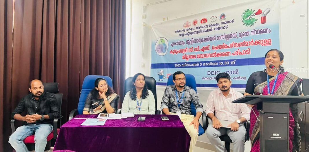 ആന്റിബയോട്ടിക് സാക്ഷര കേരളത്തിനായി ജില്ലയില് കുടുംബശ്രീ പ്രവര്ത്തകര് മുഖേന ആന്റി മൈക്രോബിയല് റസിസ്റ്റന്സ് ബോധവത്കരണ യജ്ഞം ആരംഭിച്ചു. ജില്ലയിലെ കുടുംബശ്രീ സി.ഡി.എസ് ചെയര്പേഴ്സന്മാര്ക്കായി കല്പ്പറ്റ ജനറല് ആശുപത്രിയില് നടന്ന ജില്ലാതല ബോധവത്കരണ പരിപാടി ജില്ലാ മെഡിക്കല് ഓഫീസര് ഇന്-ചാര്ജ്ജ് ഡോ ആന്സി മേരി ജേക്കബ് ഉദ്ഘാടനം ചെയ്തു.