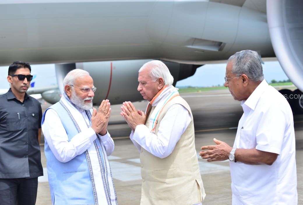 വയനാട്ടിലെ ദുരന്തബാധിത പ്രദേശങ്ങൾ സന്ദർശിക്കാനായി എത്തിയ പ്രധാനമന്ത്രി നരേന്ദ്രമോദി ശനിയാഴ്ച രാവിലെ 11.10ന് വ്യോമസേനയുടെ എയർ ഇന്ത്യ വൺ വിമാനത്തിൽ കണ്ണൂർ വിമാനത്താവളത്തിൽ ഇറങ്ങി. കേരള ഗവർണർ ആരിഫ് മുഹമ്മദ് ഖാൻ, മുഖ്യമന്ത്രി പിണറായി വിജയൻ, കെ കെ ശൈലജ ടീച്ചർ എം എൽ എ, ചീഫ് സെക്രട്ടറി ഡോ. വി വേണു, ഡി ജി പി ഷേഖ് ദർവേശ് സാഹിബ്‌, ജില്ലാ കളക്ടർ അരുൺ കെ വിജയൻ, സിറ്റി പോലീസ് കമ്മിഷണർ അജിത് കുമാർ, എ പി അബ്ദുള്ളക്കുട്ടി, സി കെ പത്മനാഭൻ തുടങ്ങിയവർ ചേർന്ന് പ്രധാനമന്ത്രിയെ വിമാനത്താവളത്തിൽ സ്വീകരിച്ചു. കേന്ദ്ര പെട്രോളിയം വകുപ്പ് സഹമന്ത്രി സുരേഷ് ഗോപി പ്രധാനമന്ത്രിയെ വിമാനത്തിൽ അനുഗമിച്ചു. സ്വീകരണത്തിന് ശേഷം 11.17ന് പ്രധാനമന്ത്രി വ്യോമസേനാ ഹെലികോപ്റ്ററിൽ വയനാട്ടിലേക്ക് തിരിച്ചു. ഗവർണർ ആരിഫ് മുഹമ്മദ് ഖാൻ, മുഖ്യമന്ത്രി പിണറായി വിജയൻ, കേന്ദ്ര പെട്രോളിയം വകുപ്പ് സഹമന്ത്രി സുരേഷ് ഗോപി എന്നിവർ അതേ ഹെലികോപ്റ്ററിൽ പ്രധാന മന്ത്രിയെ അനുഗമിച്ചു.