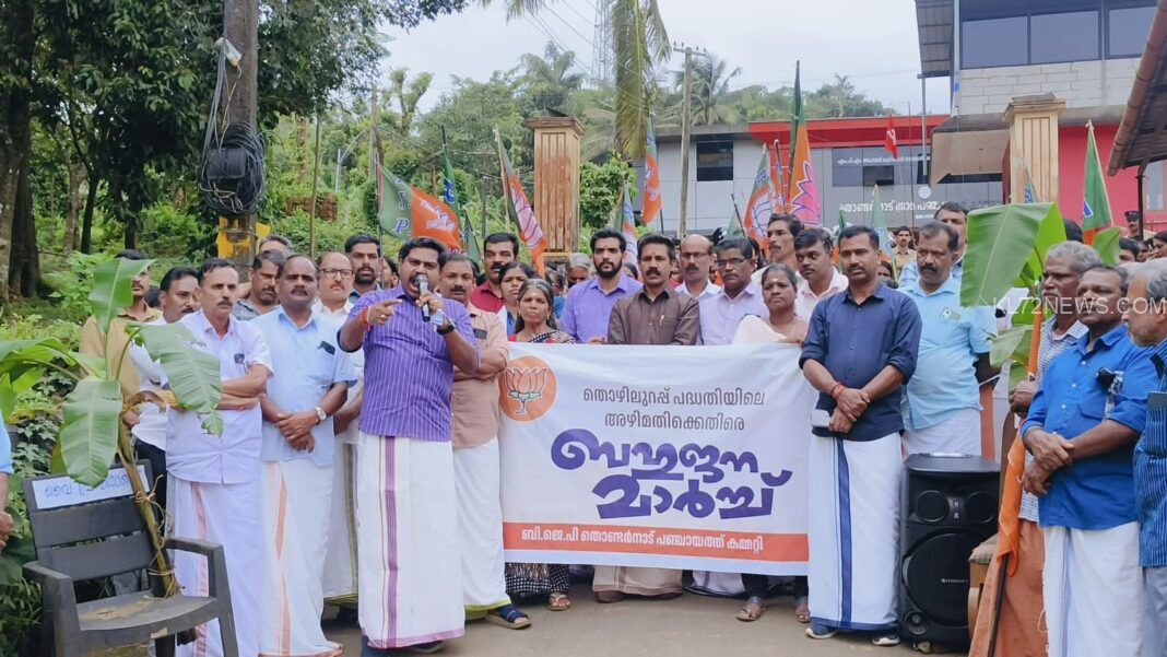 തൊണ്ടനാട്: തൊഴിലുറപ്പ് പദ്ധതിയുടെ നടത്തിപ്പുമായി ബന്ധപ്പെട്ട് പനമരം തൊണ്ടർ നാട് പഞ്ചായത്തിൽ കൊടിയ അഴിമതി. സി.പി.എം ഭരിയ്ക്കുന്ന പഞ്ചായത്തിൽ ഭരണകർത്താക്കളും ഉദ്യോഗസ്ഥരും ചേർന്ന് രണ്ടര കോടി രൂപയുടെ വൻ അഴിമതിയാണ് നടത്തിയിരിയ്ക്കുന്നത്. ഇതിനെതിരെ പഞ്ചായത്ത് യത്ത് ഓഫീസിന് മുന്നിൽ ബി ജെ പിയുടെ നേതൃത്വത്തിൽ ശക്തമായ പ്രതിഷേധ സമരം നടന്നു. അഴിമതിക്കാരായ പഞ്ചായത്ത് ത്ത് ഭരണ സമിതി പ്രസിഡന്റും വൈസ് പ്രസിഡന്റും രാജി വയ്ക്കുന്നത് വരെ ബി.ജെ പി സമരം തുടരും എന്ന് സമര പരിപാടി ഉദ്ഘാടനം ചെയ്തു കൊണ്ട് ജില്ലാ പ്രസിഡന്റ് പ്രശാന്ത് മലവയൽ പറഞ്ഞു. ബി.ജെ.പി . തൊണ്ടർനാട് പഞ്ചായത്ത് പ്രസിഡന്റ് ജയരാജ് അദ്ധ്യക്ഷത വഹിച്ചു. സംസ്ഥാന സമിതി അംഗങ്ങളായ ശിവദാസൻ മാസ്റ്റർ, സജി ശങ്കർ , പനമരം മണ്ഢലം പ്രസിഡന്റ് ജിതിൻ ഭാനു, പഞ്ചായത്ത് ജനറൽ സെകട്ടറി ഭാസ്കരൻ എന്നിവർ സംസാരിച്ചു.
