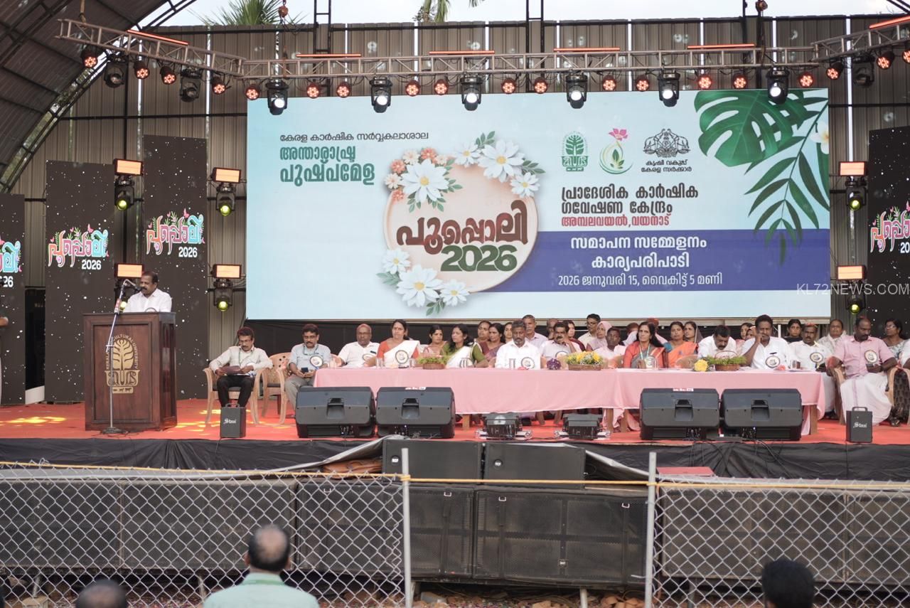 കേരള കാർഷിക സർവകലാശാലയും, കാർഷിക വികസന കർഷക ക്ഷേമ വകുപ്പും സംയുക്തമായി സംഘടിപ്പിച്ച അന്താരാഷ്ട്ര പുഷ്പമേള – പൂപ്പൊലി സമാപിച്ചു. അമ്പലവയൽ പ്രാദേശിക കാർഷിക ഗവേഷണ കേന്ദ്രത്തിൽ ജനുവരി ഒന്നിന് ആരംഭിച്ച പുഷ്പമേളയാണ് 15ന് സമാപിച്ചത്. സമാപന സമ്മേളനം സുൽത്താൻബത്തേരി എം.എൽ.എ ഐ.സി ബാലകൃഷ്ണൻ ഉദ്ഘാടനം ചെയ്തു. പൂപൊലി ഇന്ന് കേരളമൊട്ടാകെ അറിയപ്പെടുന്ന പുഷ്പമേളയായി മാറിയതായി അദ്ദേഹം അഭിപ്രായപ്പെട്ടു. വരും വർഷങ്ങളിൽ മേളയെ കൂടുതൽ ഉയര്‍ന്ന നിലവാരത്തിലേക്ക് ഉയർത്തണമെന്നും, മേളയ്ക്ക് ശേഷവും ഉദ്യാനത്തിലെ വൈകുന്നേര പ്രവർത്തനസമയം ദീർഘിപ്പിക്കുന്നതിന് നടപടികൾ സ്വീകരിക്കണമെന്നും അദ്ദേഹം നിർദേശിച്ചു.