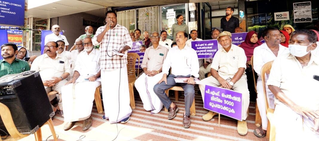 കൽപ്പറ്റ:- മിനിമം പെൻഷൻ ഒൻപതിനായിരം രൂപ ആക്കുക, ക്ഷാമഭത്താ ഏർപ്പെടുത്തുക, സീനിയർ സിറ്റിസൺസ് ട്രെയിൻ യാത്ര സൗജന്യ പുനസ്ഥാപിക്കുക തുടങ്ങിയ ആവശ്യങ്ങൾ ഉന്നയിച്ചുകൊണ്ട് പ്രൊവിഡൻ ഫണ്ട് പെൻഷനേഴ്സ് അസോസിയേഷൻ ദേശീയ തലത്തിൽ നടത്തുന്ന സമരത്തിന്റെ ഭാഗമായി കൽപ്പറ്റ പ്രൊവിഡന്റ് ഫണ്ട് പെൻഷനേഴ്സ് അസോസിയേഷൻ വയനാട് ജില്ലാ കമ്മിറ്റിയുടെ ആഭിമുഖ്യത്തിൽ കൽപ്പറ്റ പി എഫ് ഓഫീസിനു മുന്നിൽ സത്യാഗ്രഹ സമരം നടത്തി. സമരം കൽപ്പറ്റ മുനിസിപ്പൽ ചെയർപേഴ്സൺ പി വിശ്വനാഥൻ ഉദ്ഘാടനം ചെയ്തു സിഎം ശിവരാമൻ അധ്യക്ഷത വഹിച്ചു പി അപ്പൻ നമ്പ്യാർ സി എ സ്റ്റാൻലി, സി എച്ച് മമ്മി, എ സോമൻ, വി യൂസഫ്, കെ പി രാജൻ, എ ബാലകൃഷ്ണൻ എന്നിവർ സംസാരിച്ചു.
