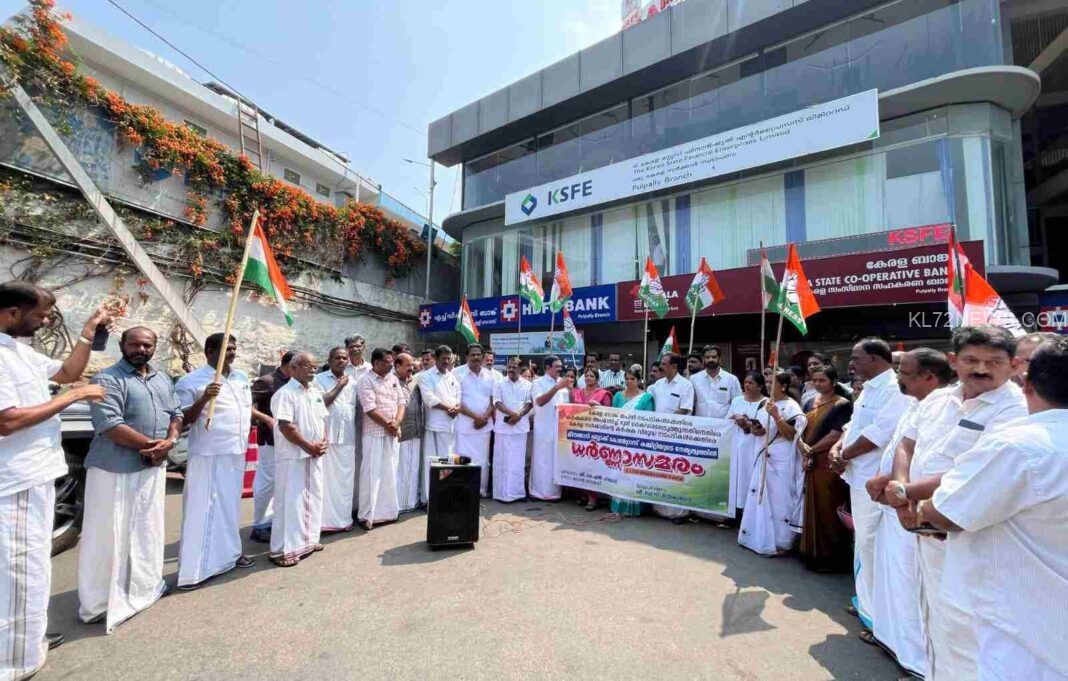 കേരള ബാങ്ക് പുല്പള്ളി ശാഖയ്ക്കു മുന്നില് കോണ്ഗ്രസ് മീനങ്ങാടി ബ്ലോക്ക് കമ്മിറ്റി സംഘടിപ്പിച്ച സമരം കെപിസിസി ജനറല് സെക്രട്ടറി കെ.എല്. പൗലോസ് ഉദ്ഘാടനം ചെയ്യുന്നു.